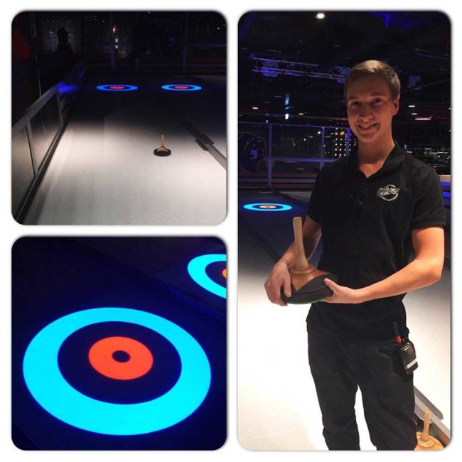 Le logiciel, programmé par Xtraice, projette les cibles de curling sur la surface, impressionant au premier abord par son visual. À partir de ce moment le système même comptabilise les points s’inscrivant sur la tablette tactile. L’exemple le plus représentatif se trouve en Suède, dans une chaine internationale de restaurant, où une une piste interactive…